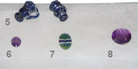 Questa vetrina raccoglie oggetti di oreficeria rinvenuti a Suasa: si tratta di anelli in oro con gemme (invv. 65225, 65227), di un anello in argento con gemma (inv. 65226), di due pendenti da collana in pasta vitrea (inv. 65229), di gemme e paste vitree isolate il cui supporto è andato perduto (invv. 65228, 65230, 65231, 65232).