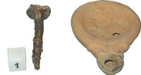 - T 135 corredo con lucerna a volute e con disco decorato, chiodo in ferro